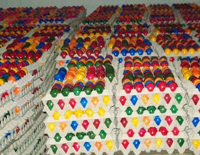 Zusätzlich muss zu jeder Anlieferung zum Lohnfärben die entsprechende Menge an neuer Eier Lagen (30ziger Papplagen) mitgeliefiert werden, damit auf diesen Lagen die bunten Eier zurück gepackt werden können.